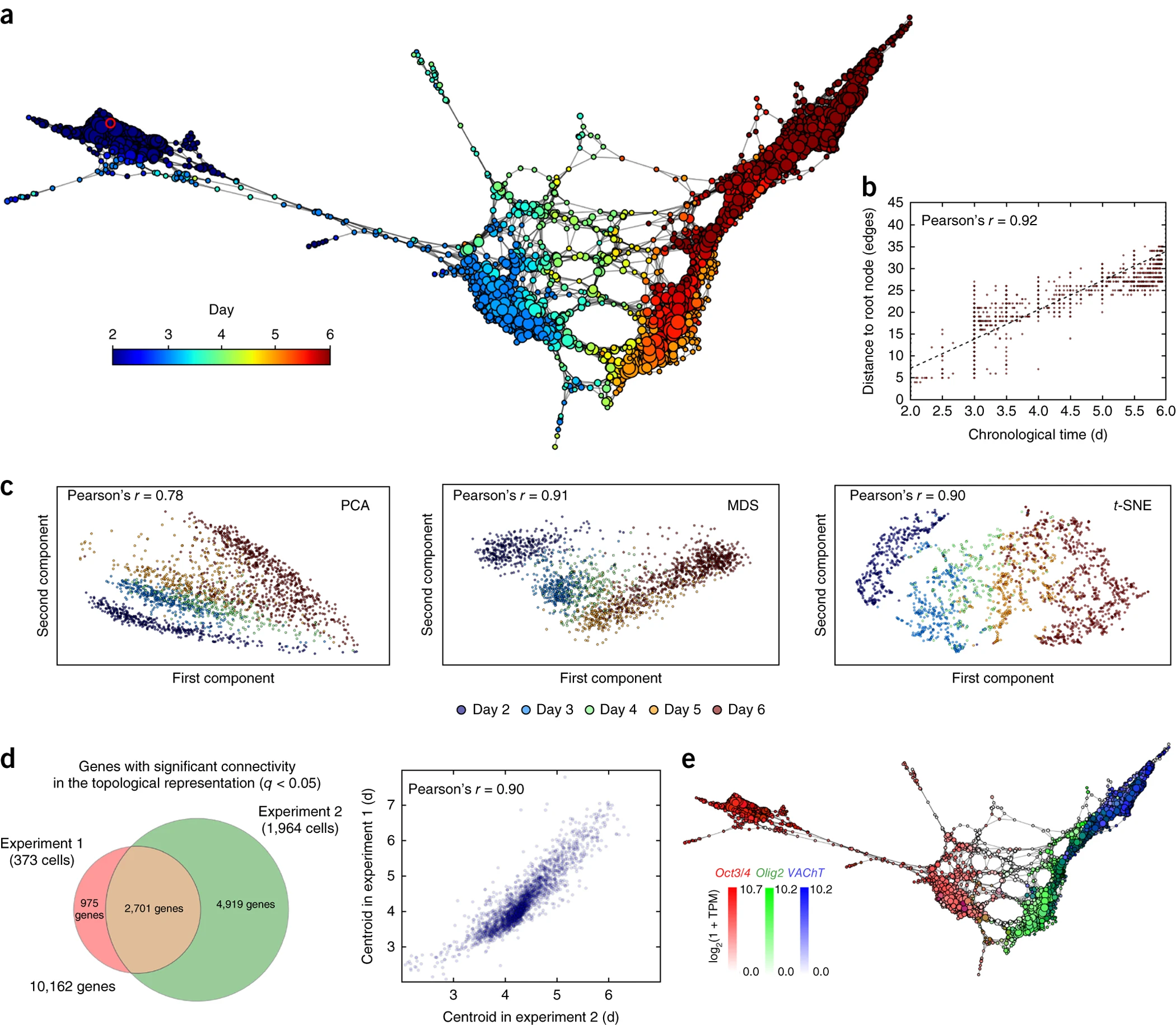 ] --- ## RNA-seq and the curse of high dimensionality - High-dimensional spaces get really weird really fast - The 10% of a unit cube occupies almost the whole cube at high dimensions - RNA-seq data lies in a 20,000-dimensional space. - Reducing dimension **and clustering** is crucial to understand the data. <img src="../../demat/figs/curse_of_dimensionality.svg" width="600" style="display: block; margin: auto;" /> --- # Mapper **is not** t-SNE, PCA, MDS, etc. - Others only take high-dimensional proximity into account. - They discard overaching shape structure in gene expression profiles. - Mapper **clusters** and **reduces dimension** while preserving the topological shape of the data.  <p style="font-size: 9px; text-align: right; color: Grey;"> Credits: <a href="https://doi.org/10.1142/9789813279827_0032">Wang <em>et al.</em> (2018)</a></p> --- class: inverse, middle, center # Mapper: a toy example ## A Topological Method for the Analysis of High Dimensional Data Sets --- background-image: url("../../tda/figs/mapper_b_00.svg") background-size: 725px background-position: 50% 95% ## Topological summary: exploration and visualization - We start with **lots** of data points `\(X\)` in a **high-dimensional** space - We want just a **handful** of points in a **low-dimensional** space that roughly preserve the original **shape** --- background-image: url("../../tda/figs/mapper_b_01.svg") background-size: 725px background-position: 50% 95% ## Pick a filter function - Assign every data point a **real** value: lens or filter function - We pick *height* in this case --- background-image: url("../../tda/figs/mapper_b_02.svg") background-size: 725px background-position: 50% 95% ## Pick a number of bins and overlap percentages - Split the filter values into a series of **overlapping bins**. - More bins → better topological resolution but risk of overfitting. --- background-image: url("../../tda/figs/mapper_b_03.svg") background-size: 725px background-position: 50% 95% ## Consider the filter preimages and cluster - Check which data points correspond to the first bin based on their filter values (the preimage) --- background-image: url("../../tda/figs/mapper_b_04.svg") background-size: 725px background-position: 50% 95% ## Consider the filter preimages and cluster - Check which data points correspond to the first bin based on their filter values (the preimage) - **Cluster** the data points in the preimage --- background-image: url("../../tda/figs/mapper_b_05.svg") background-size: 725px background-position: 50% 95% ## Consider the filter preimages and cluster - Check which data points correspond to the first bin based on their filter values (the preimage) - **Cluster** the data points in the preimage - Each cluster will form an individual **node** in our mapper graph --- background-image: url("../../tda/figs/mapper_b_06.svg") background-size: 725px background-position: 50% 95% ## Consider the filter preimages and cluster - Do the same for the next filter bin --- background-image: url("../../tda/figs/mapper_b_07.svg") background-size: 725px background-position: 50% 95% ## Consider the filter preimages and cluster - Do the same for the next filter bin - We have two clusters now --- background-image: url("../../tda/figs/mapper_b_08.svg") background-size: 725px background-position: 50% 95% ## Are there points shared in the overlap? - Draw an edge between mapper nodes if their corresponding clusters **share** data points - *Optional*: The edge thickness (weight) can be proportional to the number of shared points --- background-image: url("../../tda/figs/mapper_b_09.svg") background-size: 725px background-position: 50% 95% ## And so on and so forth - Cluster the data points corresponding to the preimage of a filter bin - Make nodes in the mapper graph --- background-image: url("../../tda/figs/mapper_b_10.svg") background-size: 725px background-position: 50% 95% ## And so on and so forth - Cluster the data points corresponding to the preimage of a filter bin - Make nodes in the mapper graph - Draw edges whenever the clusters share points --- background-image: url("../../tda/figs/mapper_b_11.svg") background-size: 725px background-position: 50% 95% ## Mapper: several moving parts - Filter function - Number of bins - Overlap percentage between bins --- class: inverse, middle, center # Mapper in genomics ## Brief literature survey ### Visualization to inspire new research --- ## Mapper to identify novel groups of breast cancer - Different branches correspond to different molecular profiles and prognosis <p style="font-size: 9px; text-align: right; color: Grey;"> Credits: <a href="https://doi.org/10.1073/pnas.1102826108">Nicolau <em>et al.</em> (2011)</a></p>  --- ## Mapper to differentiate differentiation <p style="font-size: 9px; text-align: right; color: Grey;"> Credits: <a href="https://doi.org/10.1038/nbt.3854">Rivzi <em>et al.</em> (2017)</a></p>  --- ## The shape of gene expression across plant evolution <p style="font-size: 9px; text-align: right; color: Grey;"> Credits: <a href="https://doi.org/10.1371/journal.pbio.3002397">Palande <em>et al.</em> (2023)</a></p> <div class="row"> <div class="column" style="max-width:42%"> <img style="padding: 0 0 0 0;" src="../../tda/figs/Mapper_ColorBy_Tissue.png"> <img style="padding: 0 0 0 0;" src="../../tda/figs/stress_leaf_lens.png"> </div> <div class="column" style="max-width:42%"> <img style="padding: 0 0 0 0;" src="../../tda/figs/tissue_leaf_lens.png"> <img style="padding: 0 0 0 0;" src="../../tda/figs/family_leaf_lens.png"> </div> </div> --- class: center, middle inverse # Case study ## Lung cancer <img src="../figs/amezquita_etal_2023.png" width="400" style="display: block; margin: auto;" /> --- # Setup - FPKM counts of RNAseq data from human lung tissue → 19,648 genes - 314 healthy samples (GTEx) - 500 cancerous samples (TCGA) - Considered Z-scores drawn from a Gaussian Mixture Model (GMM). - Perform a statistically accurate transformation from 2 to 1 Gau